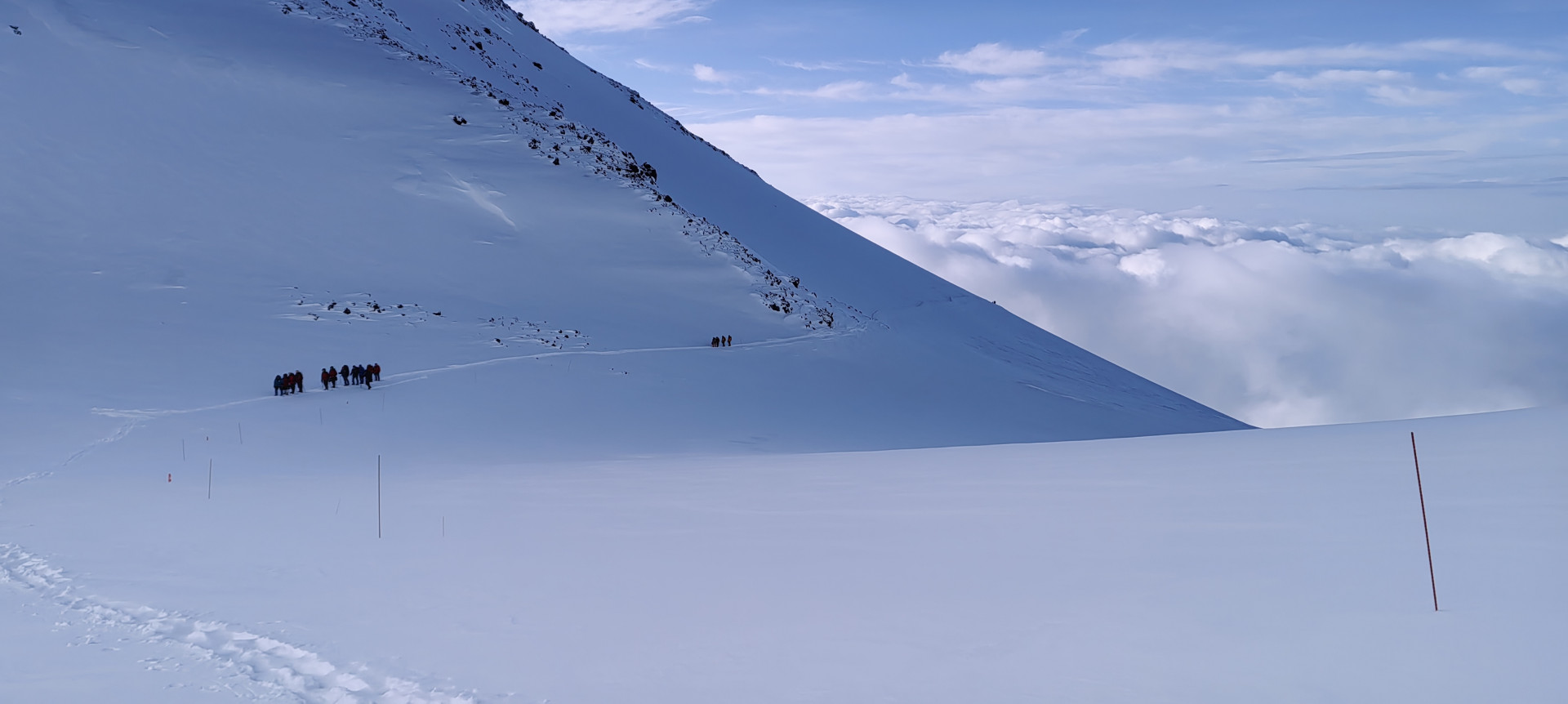 Мы легли где-то в 18:00-19:00 и проснулись в 00:30, перекусили и начали собираться – проверять рюкзак, экипировку, надевать на себя необходимые слои одежды, страховочную обвязку, альпинистские ботинки и кошки. В 2:00 мы сели в ратрак (снегоход) и поднялись на высоту 5 100 метров, где и начинается Косая полка.