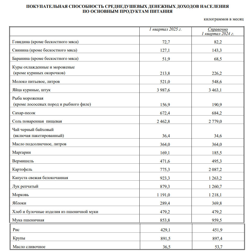 По 19 из 23 предложенных Туластатом товаров покупательная способность снизилась! Лишь по двум увеличилась и еще по двум осталась неизменной. Сравнивались первые кварталы 2025 и 2024 гг.