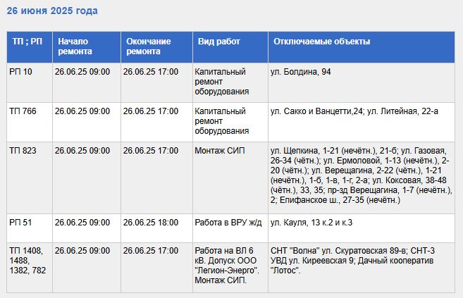 С полным списком адресов, попадающих под плановое отключение света 26 июня, а также с видами проводимых работ, в числе которых монтаж СИП, можно ознакомиться в таблице, приведенной ниже.