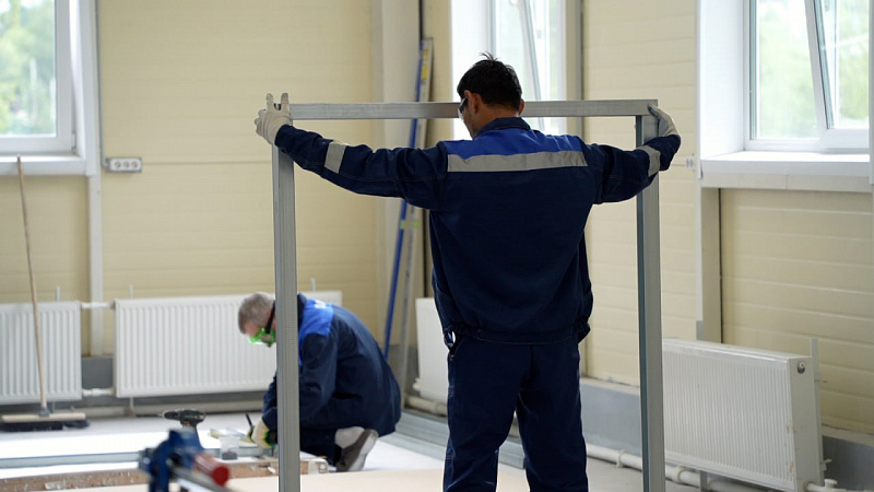 Конкурсанты прошли инструктаж по технике безопасности, после чего их ждали выполнение монтажа каркасно-обшивной конструкции, теоретическая часть, обойные работы и облицовка плиткой.