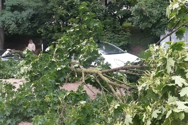 На снимках видно, что большое дерево упало на машины, которые были припаркованы на улице, задев как минимум два транспортных средства.