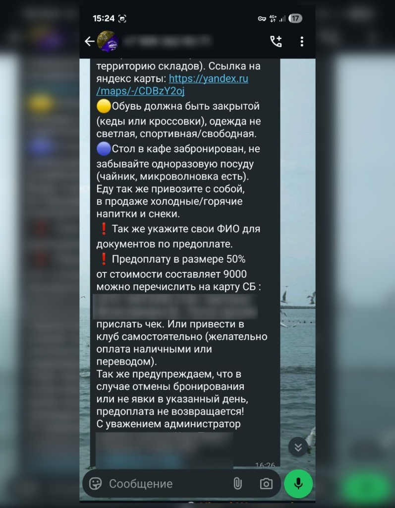 После долгой переписки стороны договор всё-таки заключили. Но условия снова поменялись: в договоре указано уже 30% предоплаты, а пункт о невозврате денег исчез.«Я должна перевести 9 тысяч какому-то человеку, про которого ничего не знаю. Ни договора, ни квитанции, ничего. В ответ — только фраза в мессенджере, что предоплата не возвращается. Это насторожило. Я попросила оформить всё по закону».