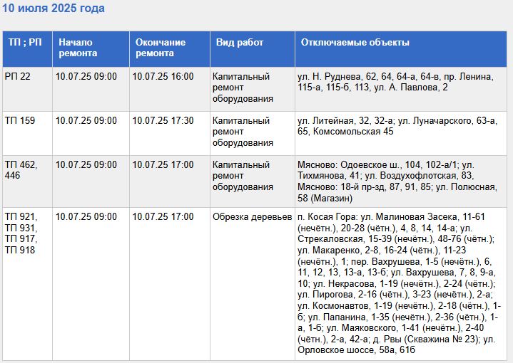 С полным списком адресов, попадающих под плановое отключение света 10 июля, а также с видами проводимых работ, в числе которых обрезка деревьев, можно ознакомиться в таблице, приведенной ниже.