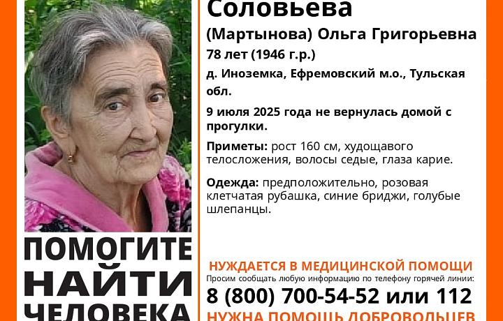 В деревне Иноземка Ефремовского района пропала 78-летняя Ольга Соловьева (Мартынова). Информация об этом появилась в сообществе регионального поискового отряда «ЛизаАлерт».
