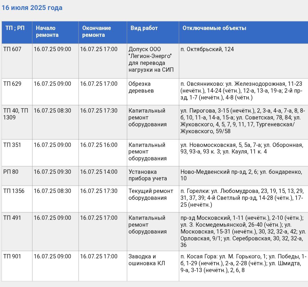 Отключения запланированы с 8:30 утра до 17:30 вечера. Рабочие будут проводить капремонт оборудования, монтаж проводов, обрезку деревьев, установку приборов учета.