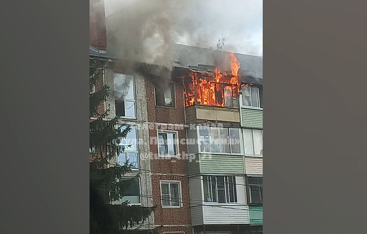 На фото можно увидеть, что загорелась одна из квартир на верхнем этаже жилого дома. По сообщению очевидцев, спустя некоторое время пожар перекинулся на соседнюю квартиру.