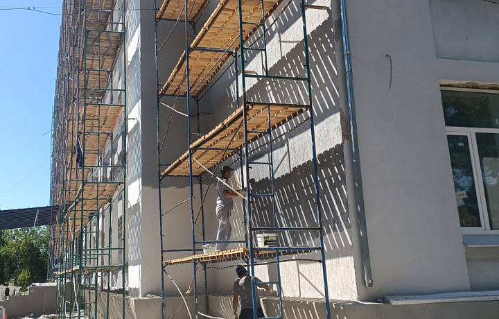 Кроме того, проходит ремонт фасада здания: ведутся работы по штукатурке и покраске. В кабинетах школы рабочие занимаются выравниваем и покраской стен.
