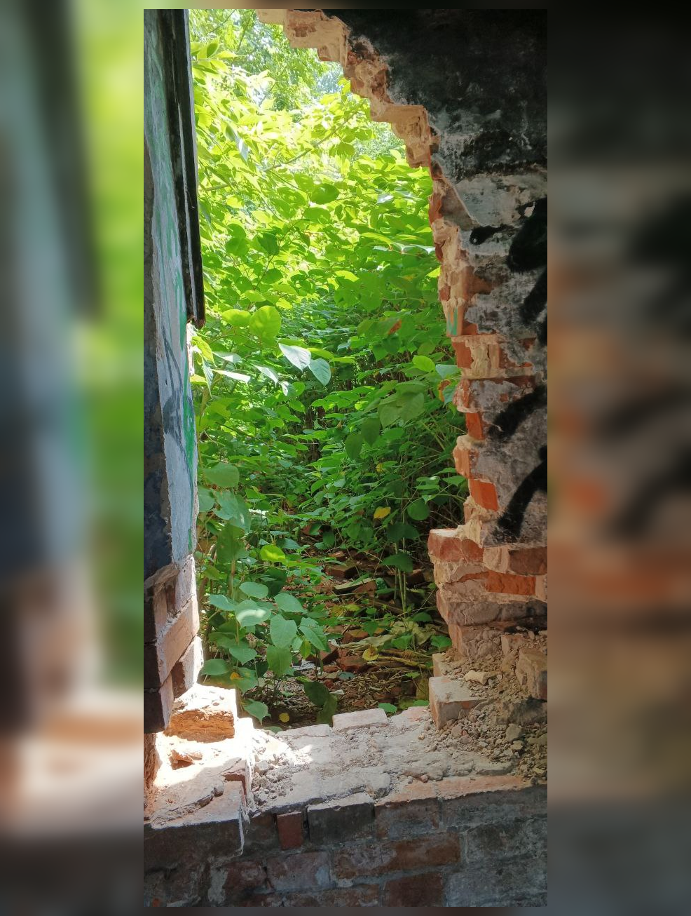 Отогнутый лист металла, открывающий проход на территорию ОКН намекает, что заброшенное здание не пустует, в нем периодически кипит жизнь.