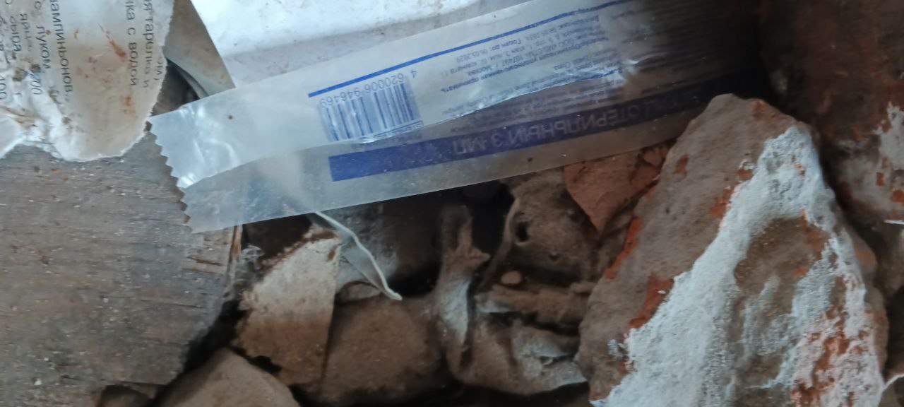 Под ногами груды мусора: от костей до битого стекла. Разодранная дверь печально приглашает посмотреть на внутреннее убранство: горы битого кирпича, бутылки из-под алкоголя, упаковки от шприцов – очевидно, чем занимаются здешние гости.