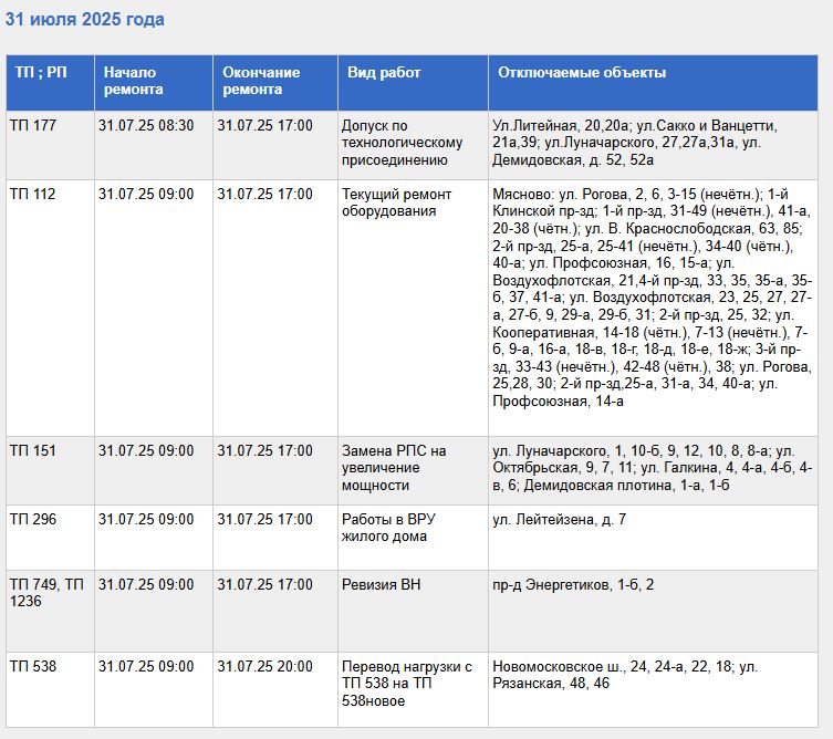 С полным списком адресов, попадающих под плановое отключение света 31 июля, а также с видами проводимых работ, в числе которых текущий ремонт оборудования, можно ознакомиться в таблице.