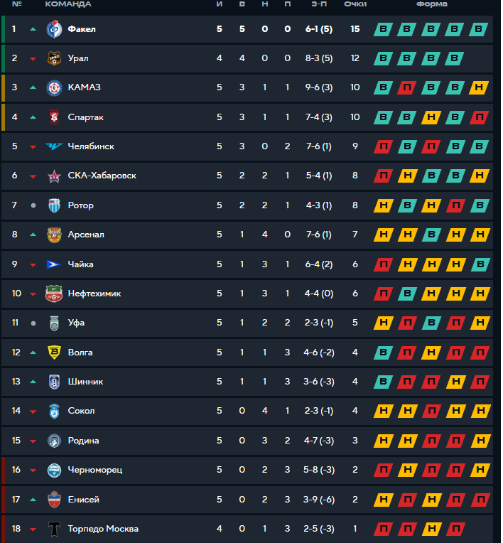 Всего две команды за первые пять туров не проиграли ни разу – «Факел» и «Арсенал».