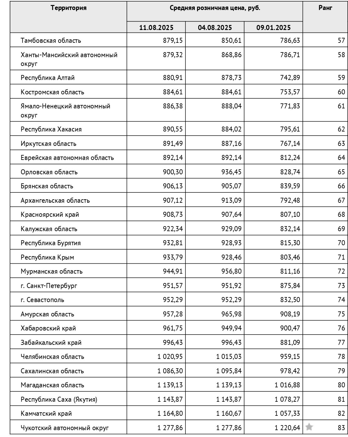 В России самая высокая цена на литр водки зафиксирована на Чукотке – 1 278 рублей. Также больше тысячи рублей за алкогольный напиток придется отдать в Челябинской, Сахалинской и Магаданской областях, на Камчатке и в Якутии.