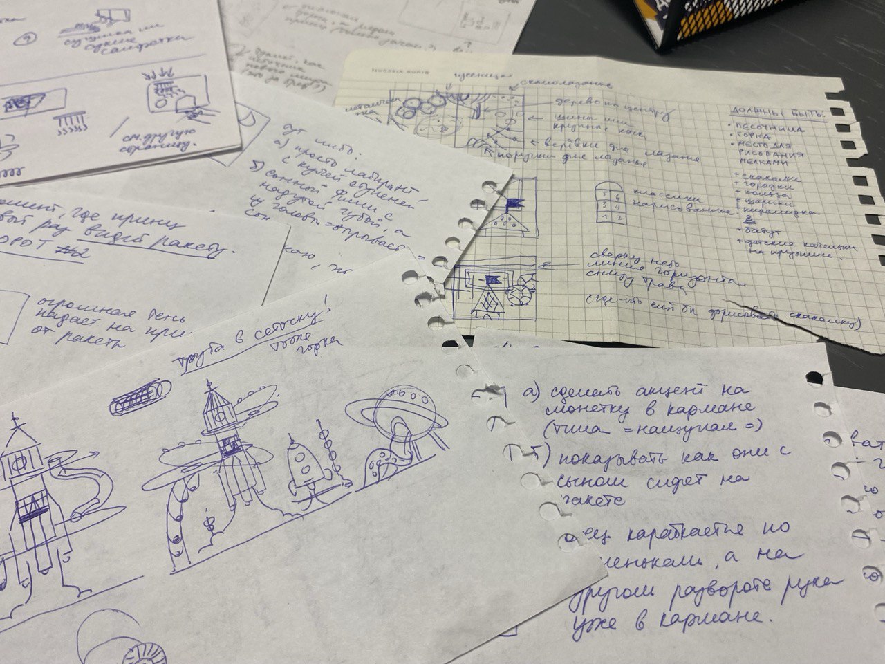 Я отталкивалась от текста Максима, причем у меня был доступ и к черновому варианту. Для создания разворота с детской площадкой важно представить, как ребенок будет взаимодействовать с этим пространством. Я составила список того, что может находиться на площадке — не абстрактной, а именно реальной, которую дети смогут увидеть в Туле. Это и песочницы, и горки, и место для рисования мелками — то, что знакомо всем ребятам.