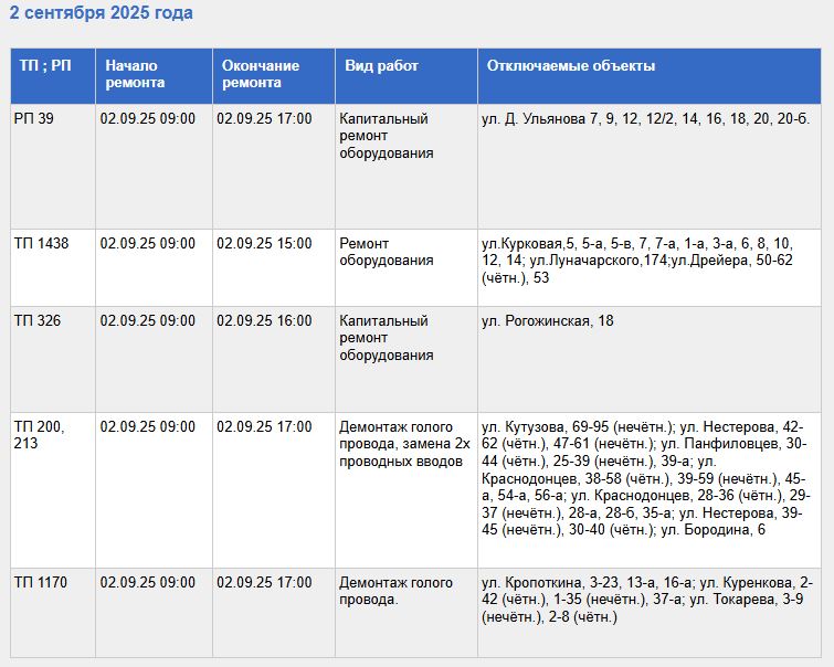С полным списком адресов, которые останутся без электроэнергии 2 сентября, а также с видами проводимых работ, в числе которых капремонт оборудования, можно ознакомиться в таблице.