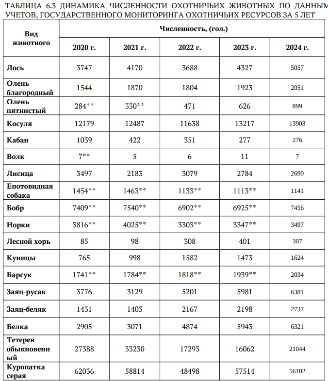 «С 2020 по 2024 год наблюдается увеличение численности копытных животных, за исключением кабана. У пушных животных: хори, куницы, заяц-русак наблюдается увеличение численности в 2021 году, в остальные годы динамика численности носит изменчивый характер», – говорится в документе.