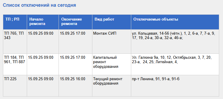 С полным списком адресов, попадающих под плановое отключение света 15 сентября, а также с видами проводимых работ, в числе которых капремонт оборудования, можно ознакомиться в таблице.