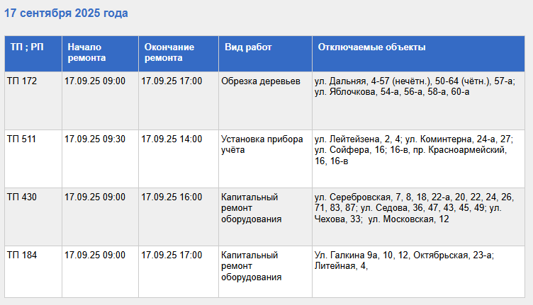 С полным списком адресов, попадающих под плановое отключение света 17 сентября, а также с видами проводимых работ, можно ознакомиться в таблице, приведенной ниже.