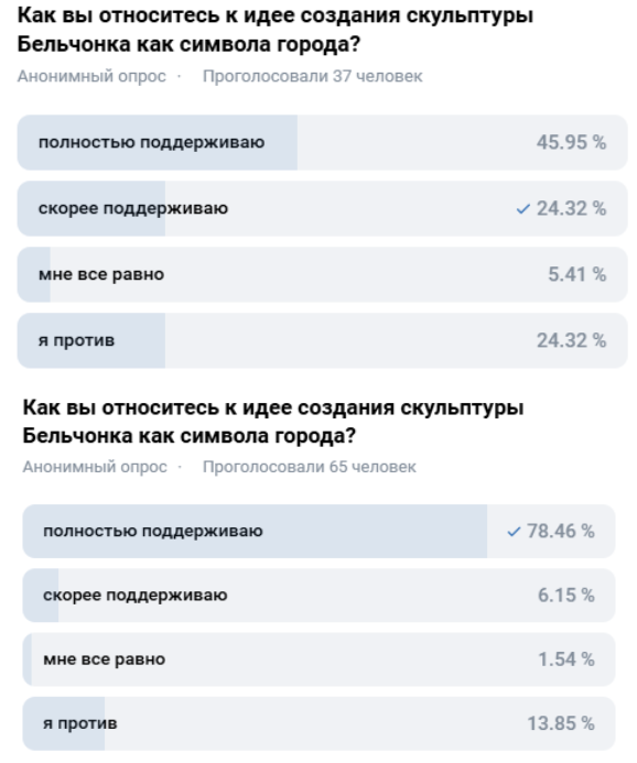 Опрос с просьбой оценить идею опубликован на странице администрации (прим. рисунок сверху) и главы администрации района Натальи Егоровой (прим. рисунок снизу). Результаты опросов отличаются, но большинство жителей поддерживают инициативу.
