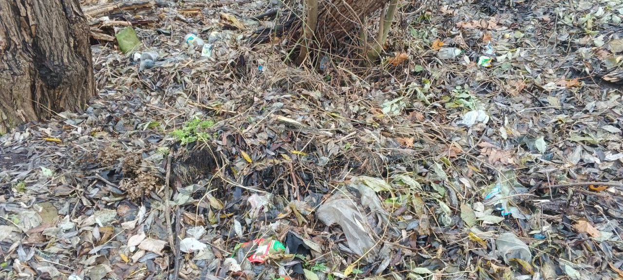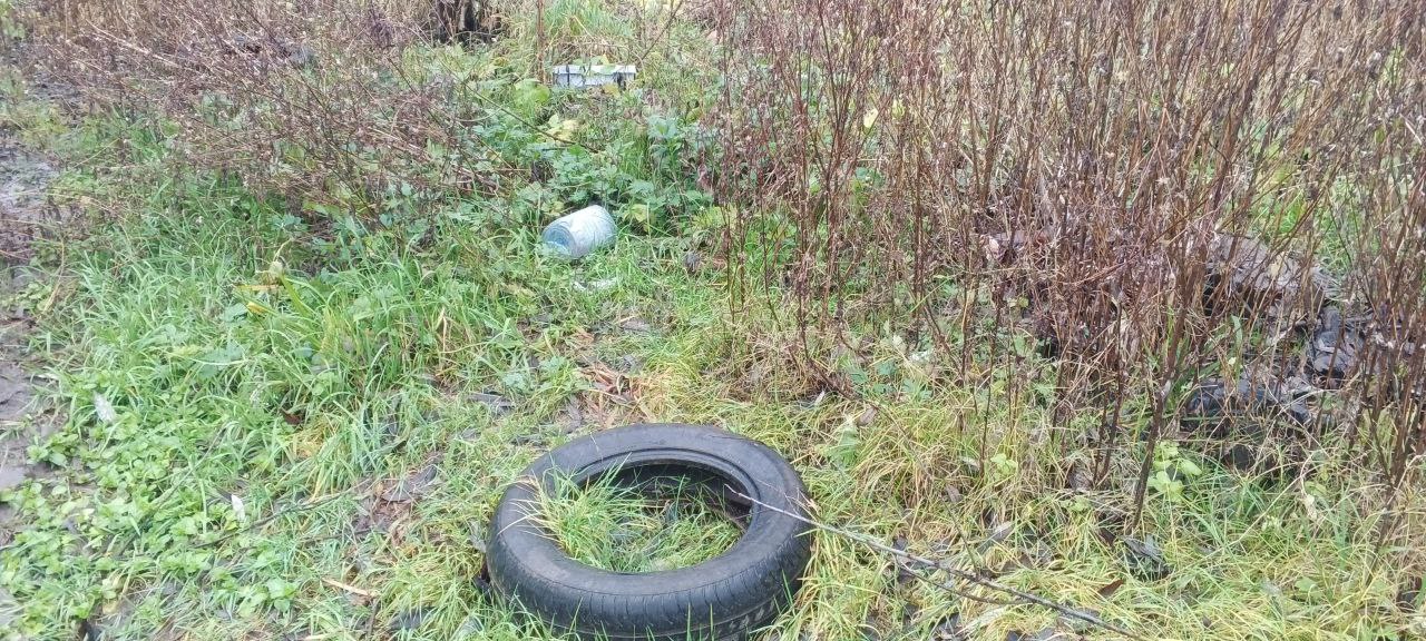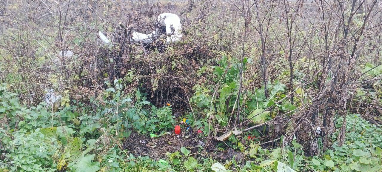 На склонах и в траве — пластиковые бутылки, остатки упаковок из-под чипсов и шоколада, использованные салфетки, рулон ваты, пакет с мусором внутри, несколько металлических предметов, похожих на вёдра, автомобильные шины и множество сигаретных окурков.