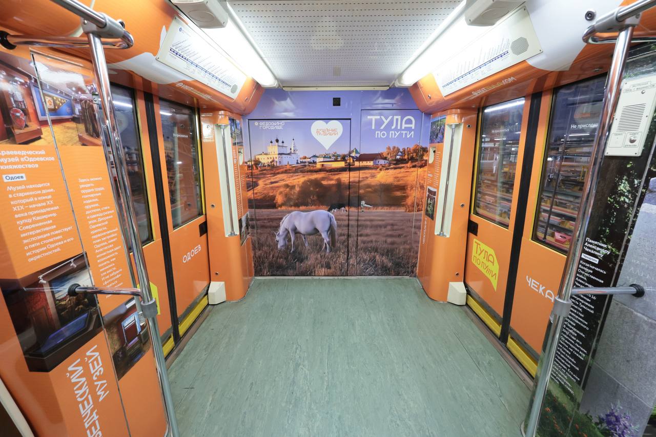 В основу дизайна поезда легли главные достопримечательности и символы региона. Внутри состав представлена информация о знаковых туристических местах – Тула, Ясная Поляна, Алексин, Богородицк, Венев, Куликово Поле, Заокский, Епифань, Белев, Чекалин, Одоев.