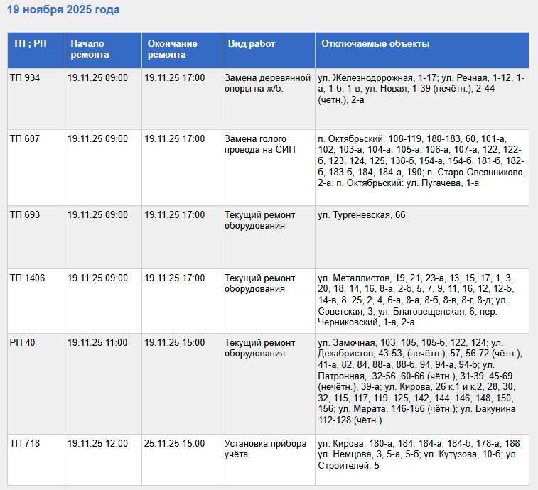 С полным списком адресов, попадающих под плановое отключение света 19 ноября, а также с видами проводимых работ можно ознакомиться в таблице.