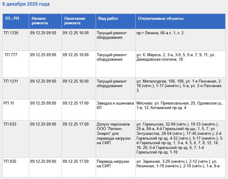 С полным списком адресов, попадающих под плановое отключение света 9 декабря, а также с видами проводимых работ, можно ознакомиться в таблице, приведенной ниже.