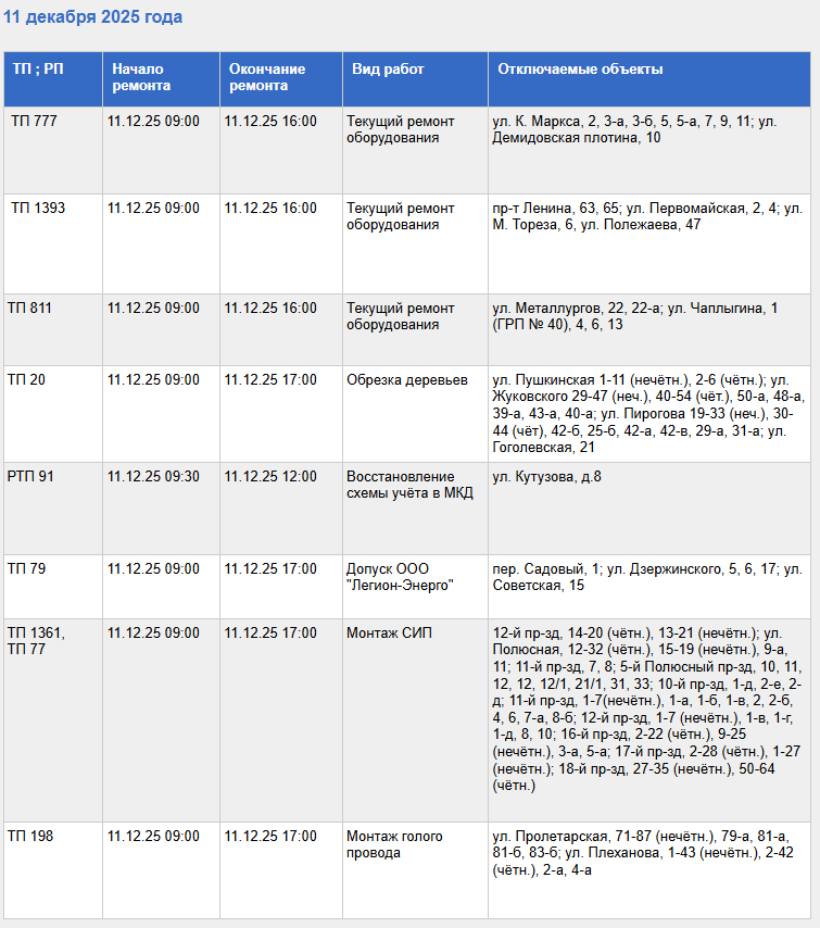 С полным списком адресов, попадающих под плановое отключение электричества 11 декабря, а также с видами проводимых работ, в числе которых монтаж голого провода, можно ознакомиться в таблице, приведенной ниже.
