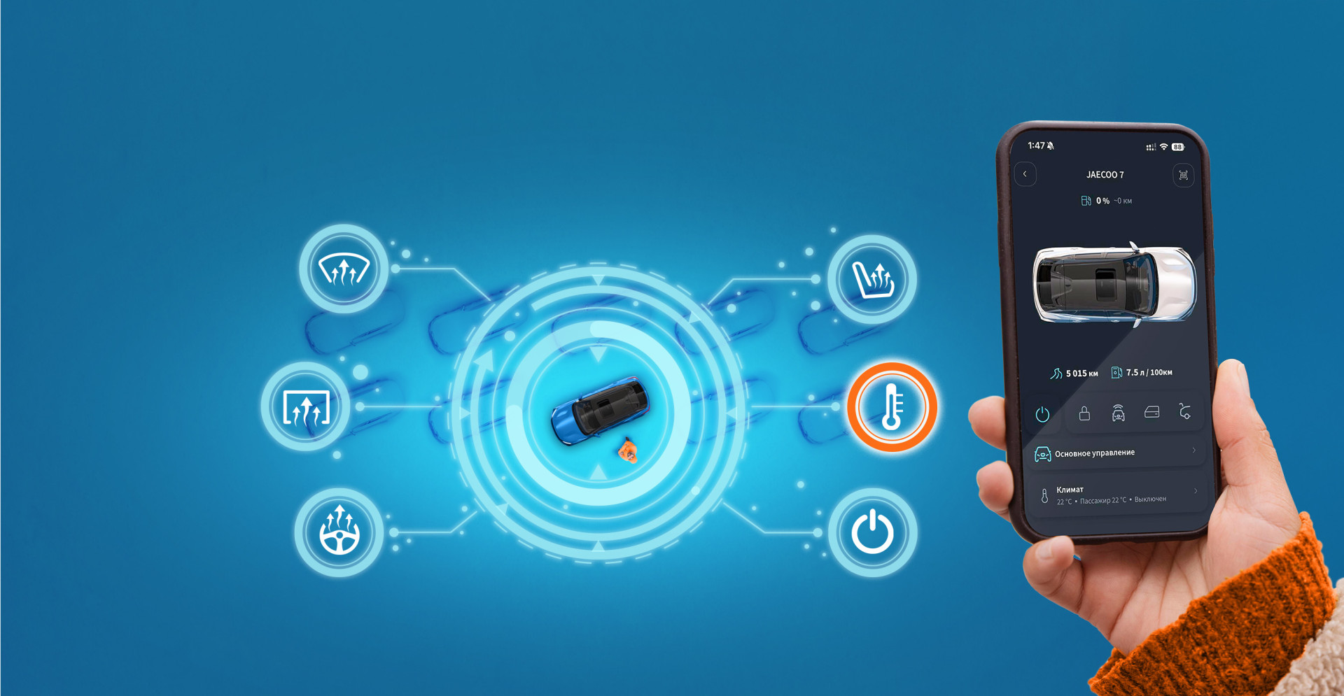Пока заваривается кофе, владелец OMODA C7 уже знает: в салоне комфортно. Двигатель запущен дистанционно, климат-контроль заранее прогрел или охладил пространство, стекла очищены, руль и сиденья готовы к поездке. Не нужно выходить раньше или мириться с дискомфортом, автомобиль подстраивается под расписание, а не наоборот.