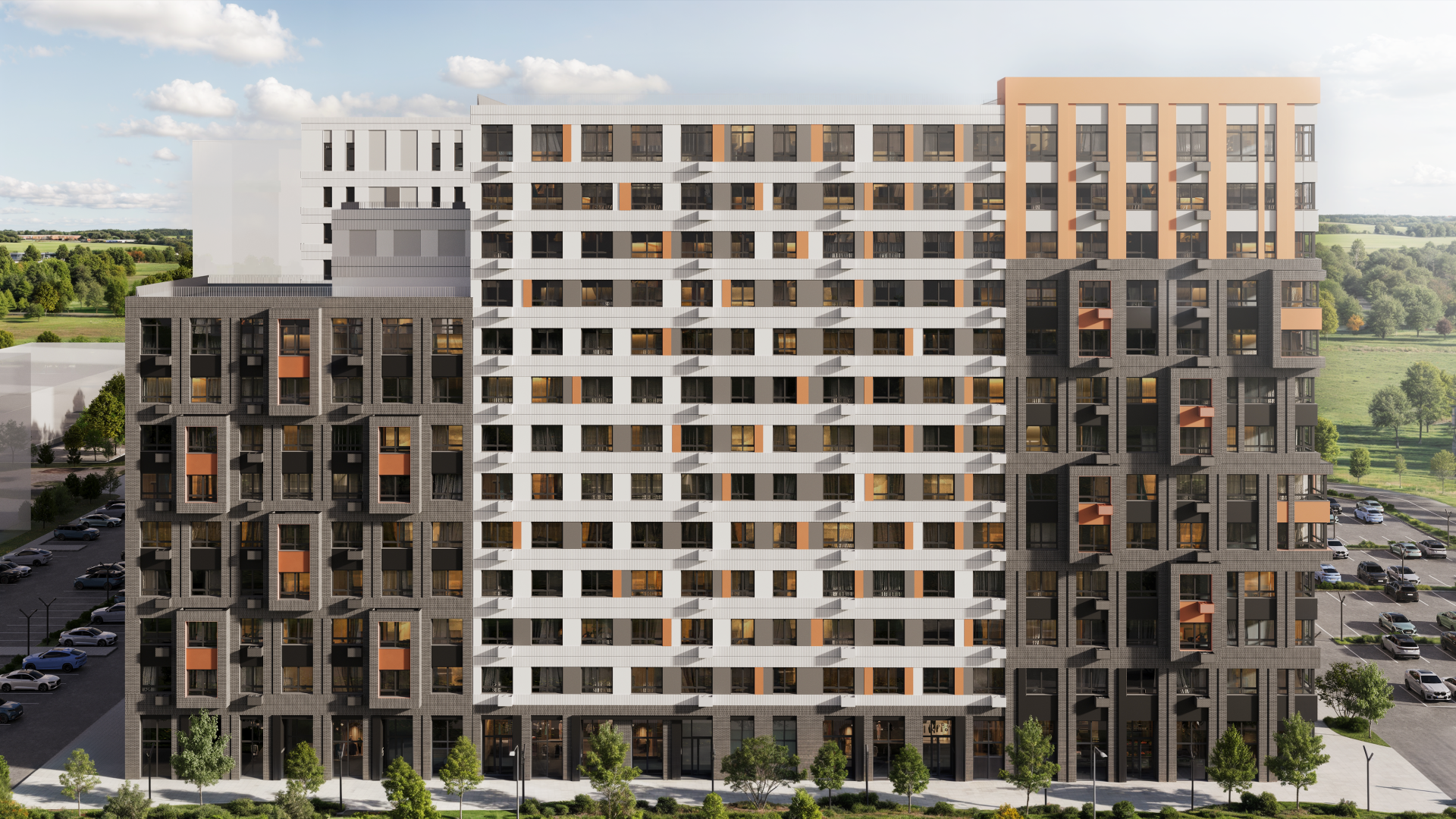 Архитектурная концепция развивалась на основе мотивов природного ландшафта и вертикальных ритмов деревьев. Фасады прорабатывались совместно с тульской проектной командой. Один из центральных фасадных акцентов – визуальная интерпретация массивного корняосиновой коры, интегрированная в архитектурный облик первой очереди.