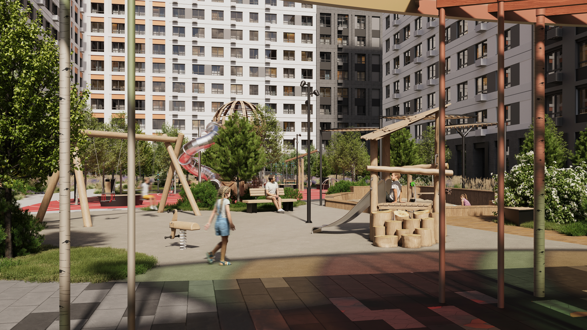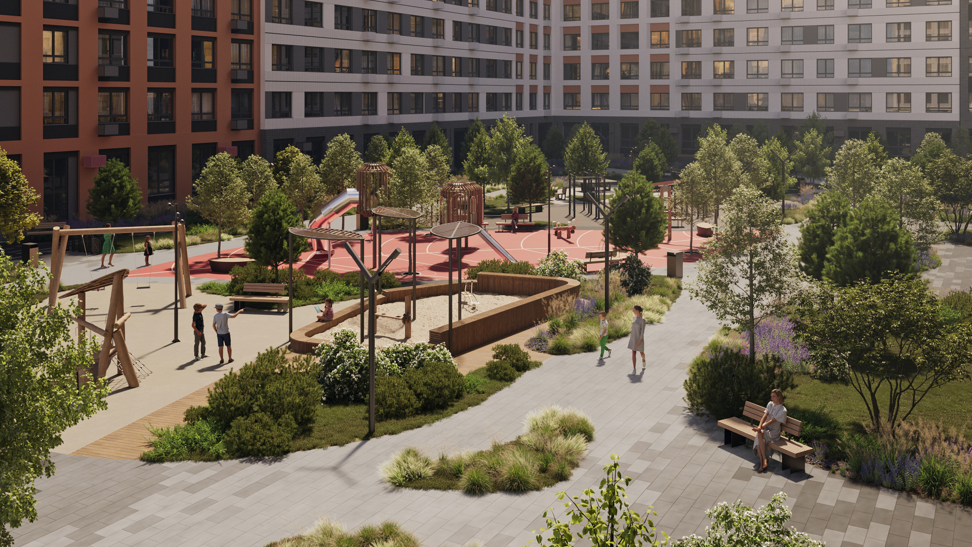 Первая очередь расположена у въезда в квартал. Она включает два корпуса переменной этажности (9–13 этажей), 610 квартир и 27 коммерческих помещений. В рамках следующих стадий запланировано строительство детского сада на 240 месте и многоуровневого паркинга, интегрированного в архитектурную структуру комплекса.