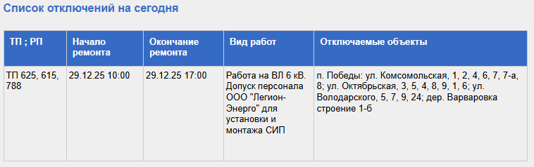 С полным списком адресов, попадающих под плановое отключение света 29 декабря, а также с видами проводимых работ, можно ознакомиться в таблице, приведенной ниже.
