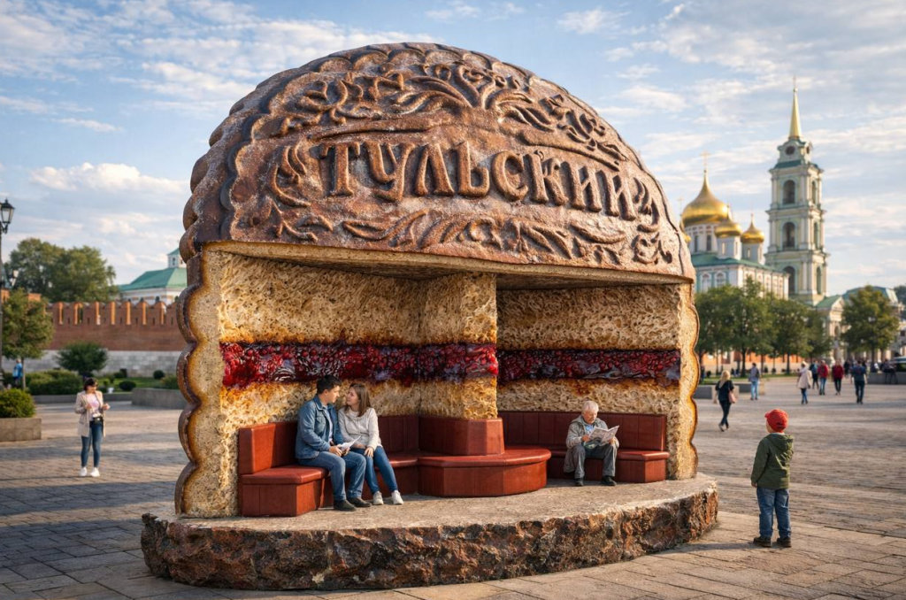 Ещё одна концепция для новых достопримечательностей Тулы от нейросетей – памятник тульскому прянику в разрезе. Не глянцевый сувенир, а честный «анатомический» пряник: с начинкой, слоями теста и фактурой. По задумке, материал мог бы имитировать текстуру выпечки, а внутри располагалась бы небольшая зона отдыха. Такой памятник подчёркивал бы ремесленную сторону города и одновременно ломал привычные представления о том, каким должен быть городской символ.