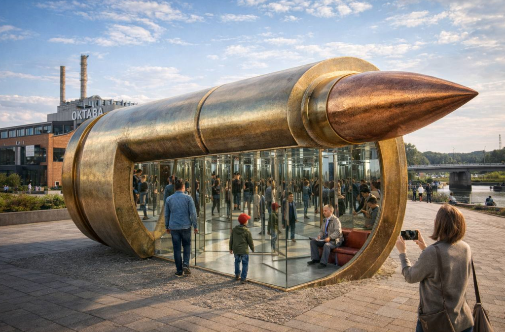 На территории кластера «Октава» или где-то «в пространстве у Зареченского моста» нейросеть предлагает установить современный арт-объект в виде гигантского винтовочного патрона, внутри полого стержня которого проложен зеркальный лабиринт. Войдя внутрь, человек видит бесконечное отражение самого себя. Идея – показать рефлексию о двойственной природе оружейного мастерства: защита и агрессия, война и мир, мощь и ответственность. Объект провоцирует на размышления, а не просто на фото.