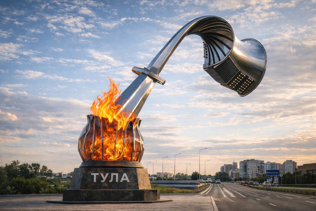 А как вам футуристическая композиция, объединяющая три символа. Из «кузнечного горна» (абстрактная форма из стекла с подсветкой, имитирующей жар) «вырастает» идеально отполированный стальной клинок, который на конце плавно изгибается и превращается… в раструб баяна. Это метафора пути Тулы: от кузнечного ремесла и оружейной стали – к миру, музыке и знаменитым тульским гармоникам. Сложно, спорно, но точно запоминается.