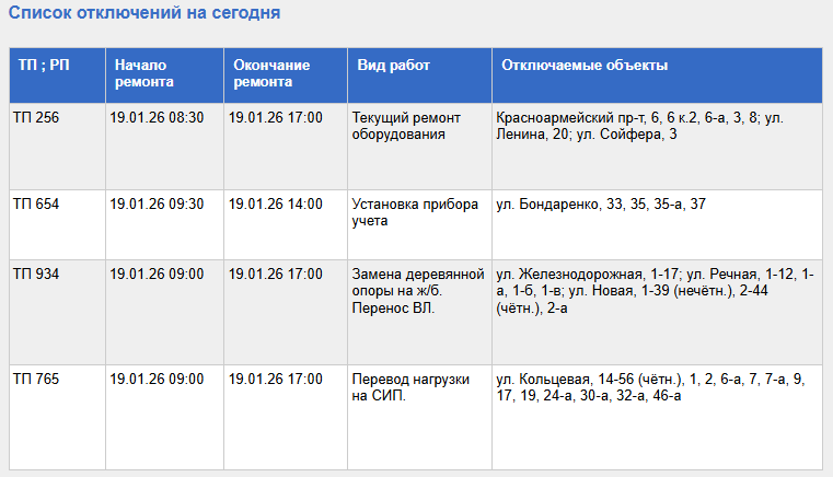 С полным списком адресов, попадающих под плановое отключение света 19 января, а также с видами проводимых работ, в числе которых текущий ремонт оборудования, можно ознакомиться в таблице.