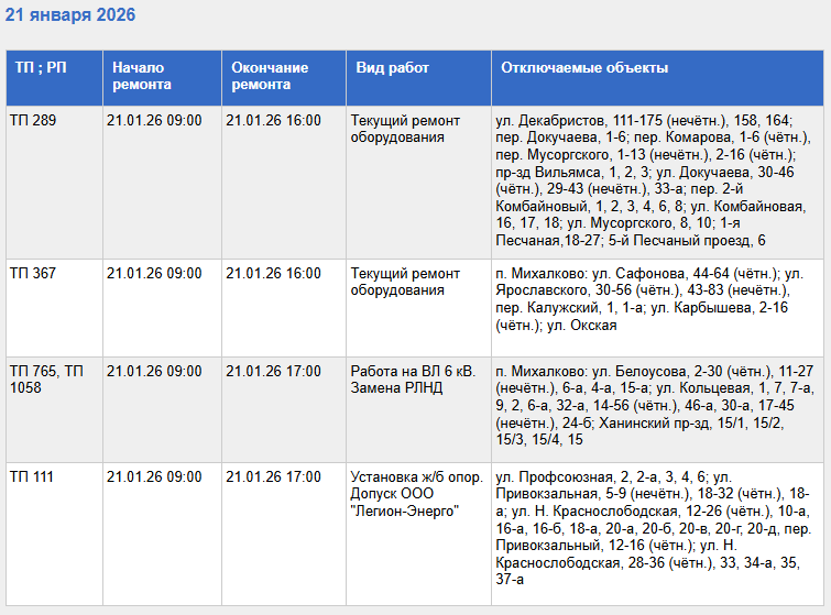 С полным списком адресов, где в Туле не будет света 21 января, а также с видами работ, в числе которых установка железобетонных опор, можно ознакомиться в приведенной таблице.