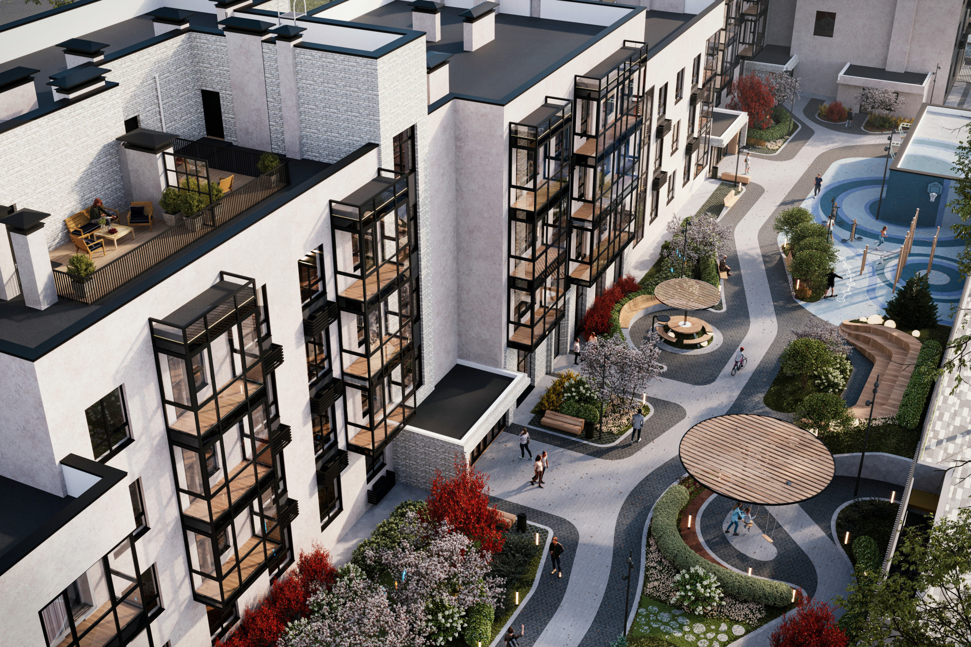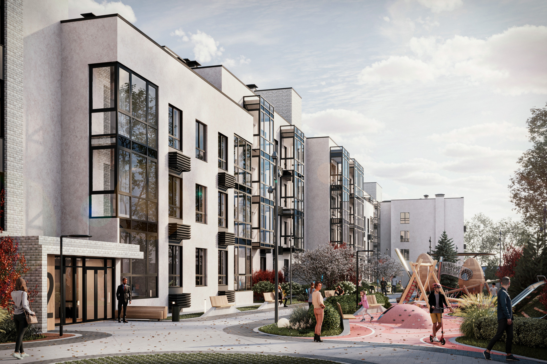 - Благоустроенная территория: Придомовая территория проектируется как продолжение жилого пространства. Здесь будут предусмотрены детские и спортивные площадки, зоны для тихого отдыха с ландшафтным озеленением.