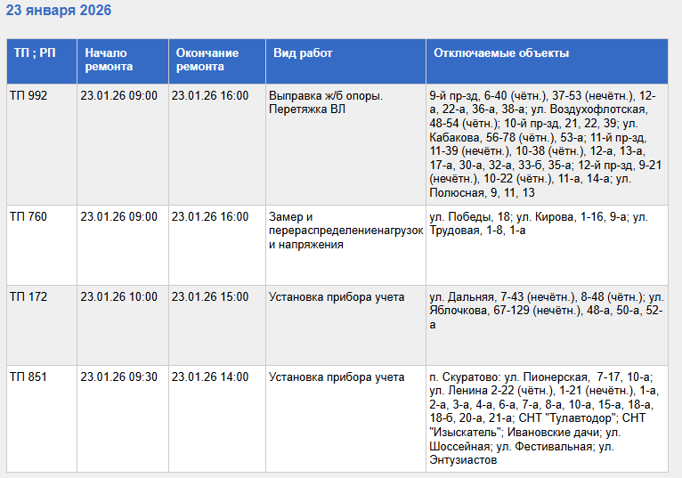 С полным списком адресов, попадающих под плановое отключение света 23 января, а также с видами проводимых работ, можно ознакомиться в таблице, приведенной ниже.