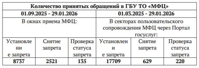 Например, в окнах приема сотрудники Центров приняли 8 737 человек, пожелавших установить запрет и более 2,5 тысяч жителей региона, которые в итоге решили отказаться от такого ограничения.