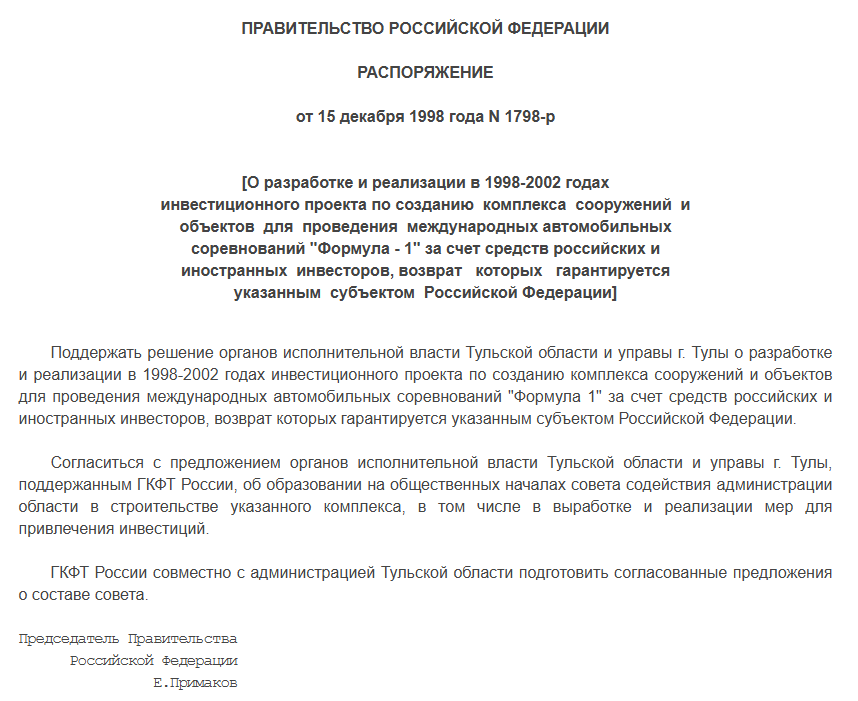 Реализовать проект хотели, судя по документу, до 2002 года! Забавно, что в 2002 году студент из Краснодара, готовя курсовую работу «Туристские перспективы строительства спортивного гоночного комплекса класса «Формула-1» в России», отмечал, что о проекте уже забыли.