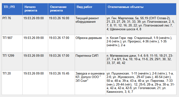 С полным списком адресов, попадающих под плановое отключение света 19 марта, а также с видами проводимых работ, можно ознакомиться в таблице, приведенной ниже.