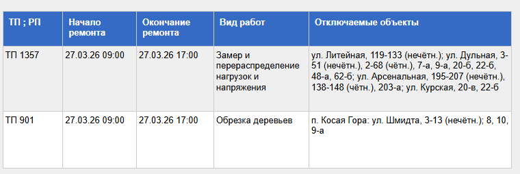 С полным списком адресов, попадающих под плановое отключение света 27 марта, а также с видами проводимых работ, можно ознакомиться в таблице, приведенной ниже.