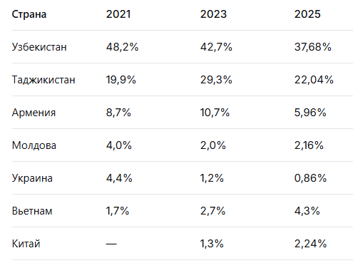 В 2021 году узбеки составляли 48,2% всех поставленных на учёт, в 2023‑м — 42,7%, а к 2025 году доля снизилась до 37,68%. Поток из Узбекистана остаётся доминирующим, но ослабевает. В то же время доля приезжих из Таджикистана выросла. В 2021 году таджики давали 19,9% потока, в 2023‑м — уже 29,3%, а в 2025‑м — 22,04%. Вместе с Узбекистаном Таджикистан формирует порядка 60% всего миграционного потока в регион.