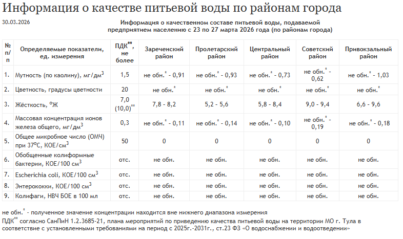 С 23 по 27 марта 2026 года максимальная жесткость воды зарегистрирована в Привокзальном и Советском округах Тулы, а максимальная мягкость — в Пролетарском.
