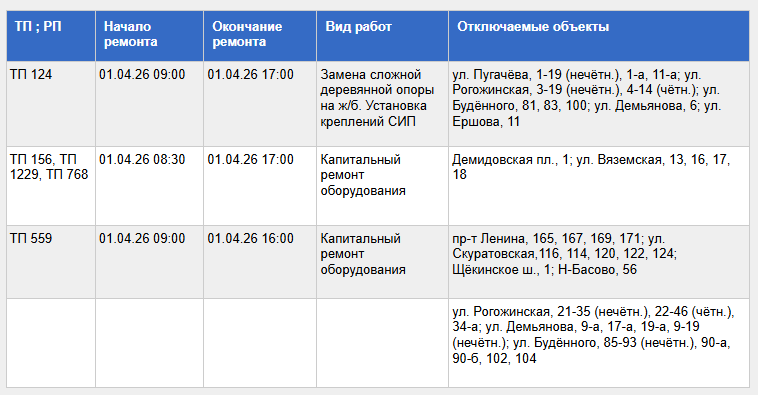 С полным списком адресов, по которым в Туле отключат свет 1 апреля, а также с видами проводимых работ, можно ознакомиться в представленной ниже таблице.