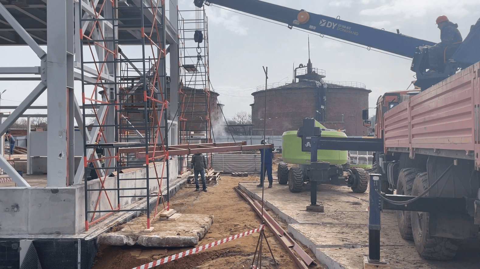 Всего на объекте задействовано 68 рабочих и 16 единиц техники. Работы идут по графику. Работы на площадке обезвоженного осадка выполнены на 100%, обустроены резервуар очищенных вод и камеры распределения иловых отстойников. Сейчас выполняются работы по монтажу металлоконструкций и панелей на здание цеха. На 80% выполнена металлоконструкция, начата установка панелей.