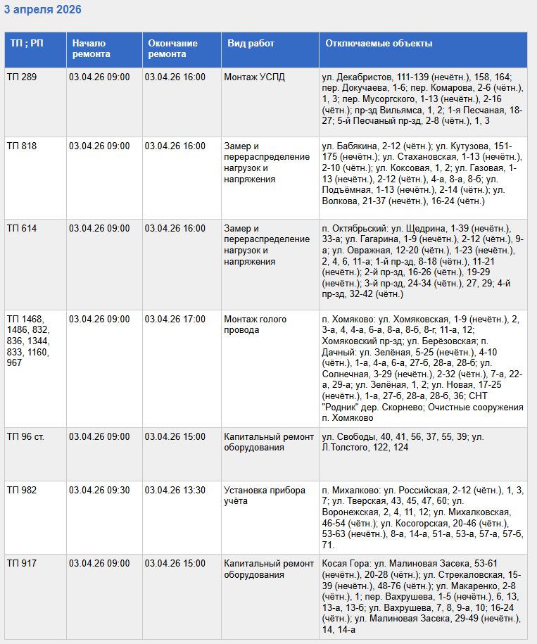 С полным списком адресов, которые останутся без электроэнергии 3 апреля, а также с видами проводимых работ, в числе которых капремонт оборудования и монтаж голого провода, можно ознакомиться в таблице.