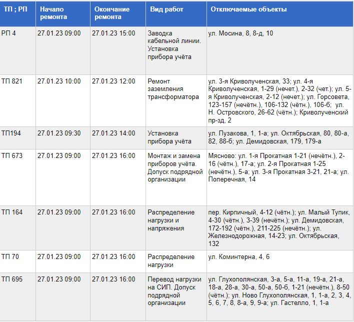 Электричество будет временно отключено из-за ремонтных работ, указанных в списке ниже. Также там указано время отключения и адреса: