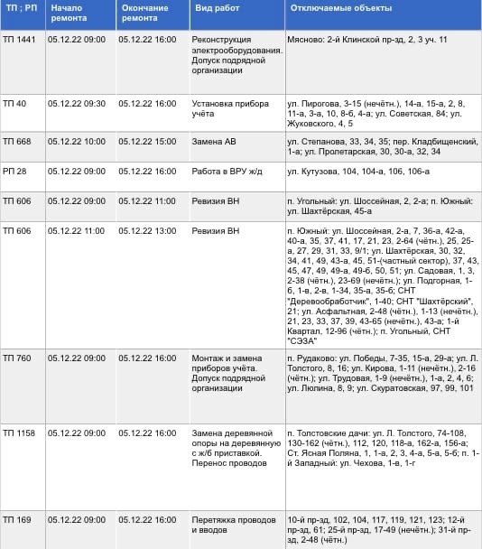 Ниже опубликована таблица с графиком отключения света в квартирах, видом работ, а также списком адресов, где не будет электричества: