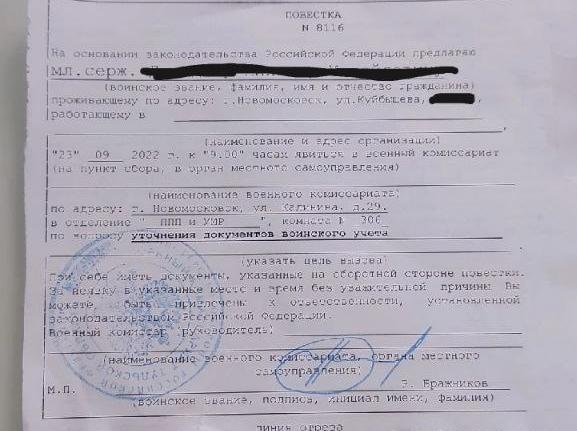 объявленной вчера, 21 сентября, президентом России Владимиром Путиным, некоторым жителям Тульской области уже начали приходить повестки, передает телеграм-канал ЧП Новомосковск.